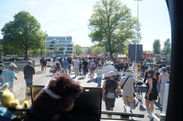 Am 1. Mai 2025 nahmen wir an der Demonstration des Bündnisses „Wer hat, der gibt“ unter dem Motto „Superreiche? Superscheiße!“ teil. Der Demonstrationszug startete um 13:30 Uhr an der Sierichstraße in Winterhude und führte durch die wohlhabenden Stadtteile Harvestehude und Uhlenhorst entlang der Alster bis zum Hotel Atlantic.