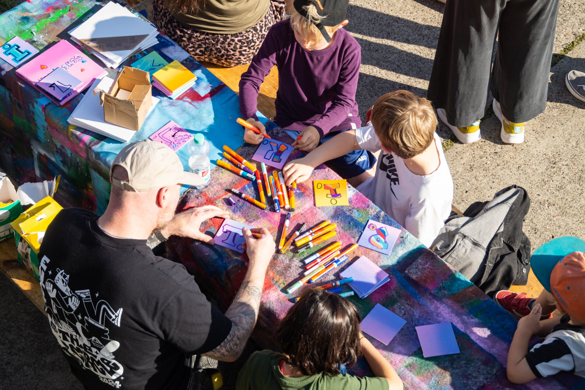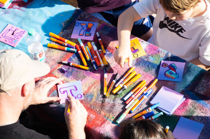 Beatboy Delles, professioneller Graffiti-Künstler und künstlerischer Leiter des Esche Jugendkunsthauses, hat das Thema Kinderrechte auf visuelle Weise aufgegriffen. Nachdem er die Grundlagen des Graffiti erklärt hatte, konnten die Kinder sich künstlerisch ausleben und damit auch ihr Recht auf freie Meinungsäußerung und Identität sichtbar machen.